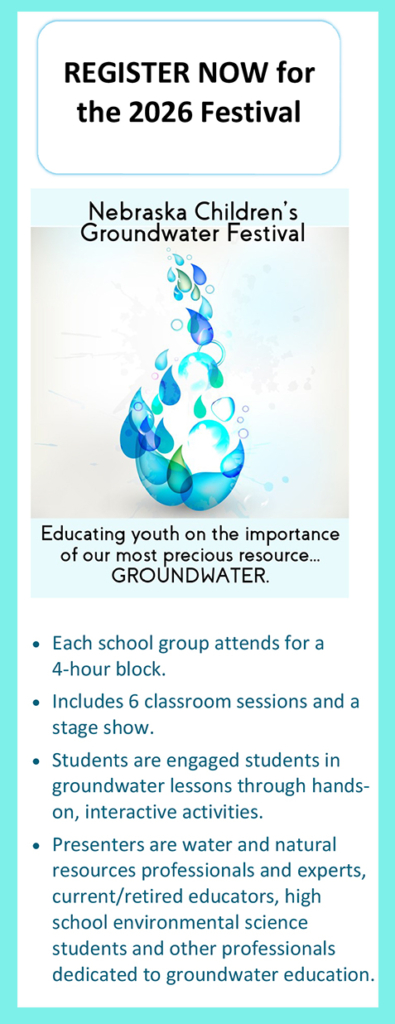 VOLUNTEER NEXT YEAR! Join the Central Platte NRD as we host youth at the Nebraska Children’s Groundwater Festival on May 12, 2026! Sign up to volunteer by calling 308-385-6282 or email Marcia Lee at lee@cpnrd.org.